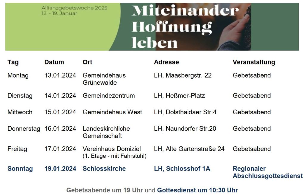 Wir feiern am Sonntag, den 12. Januar, um 17 Uhr unseren Gottesdienst im Gemeinschaftssaal.