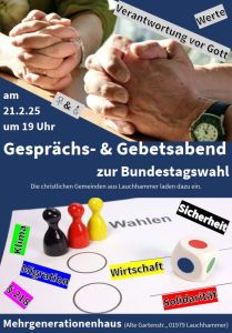 Am Freitag, den 21. Februar, findet um 19 Uhr der Gesprächs- & Gebetsabend zur Bundestagswahl